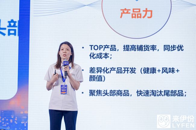 ▲来伊份品牌营销中心CGO姜振多进行主题演讲以提升单店业绩增长为核心,来伊份围绕不同的用户群制定专属的营销与产品策略。升级门店软装、产品形象包装,从传统营销向数字化营销转型,将营销热点与门店紧密联动,实现全生命周期的运营,寻求“破圈”之道。将声量、流量转化成销量,不遗余力地为合作伙伴赋能。“从声量、流量到销量,我们会更好地把来伊份的大旗插遍全国的大江南北。”姜振多不仅说出了来伊份品牌营销的决心,也喊出了所有合作伙伴共同的心声。截至目前,来伊份已累计服务用户8.6亿人次,全网拥有8900万用户,私域用户数达4500多万,庞大的用户集群是来伊份核心的品牌资产,把美好的愿景与价值观传递给消费者,则是来伊份始终坚持努力在做的。以产品为抓手,加强供应链质价比门店的核心是业绩,而实现业绩的核心,则是对产品的抓手。针对产品,来伊份集团副总裁兼供应链管理总裁张丽华表示“来伊份供应链做的不仅仅是追求数量,更关注质量,以用户为导向开发市场能接受的新品,是我们正在进行变革以及通过系统化实现的方向。”
